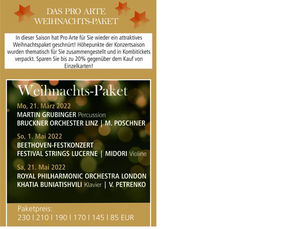 Bestellen Sie jetzt Karten oder auch das attraktive, preisermäßigte Geschenk-Paket für die Pro Arte Konzerte Essen, das wir Ihnen für den Gabentisch geschnürt haben.