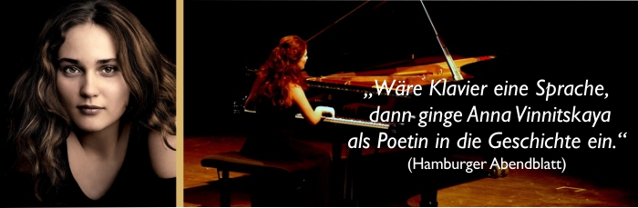 Anna Vinnitskaya erobert die Bühnen der Musikwelt mit ihrer außergewöhnlichen Sensibilität und ihrem tiefen Verständnis für die Musik. Sie verschmilzt mit dem Klavier, wird eins mit den Kompositionen und entführt ihr Publikum auf eine emotionale Reise durch die Klanglandschaften der Meisterwerke.